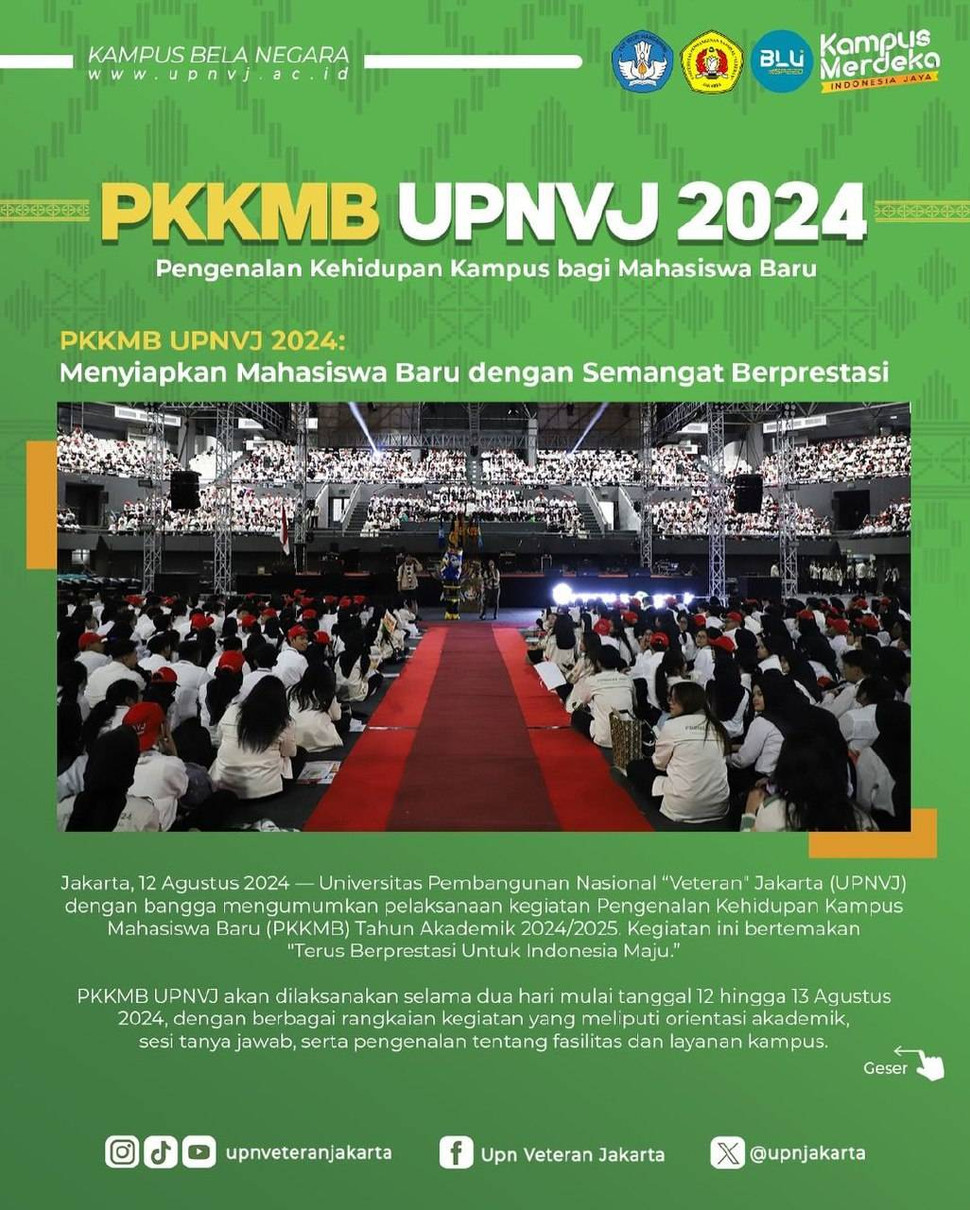 Pada tanggal 12 dan 13 Agustus 2024, Universitas Pembangunan Nasional "Veteran" Jakarta telah melaksanakan kegiatan Pengenalan Kehidupan Kampus bagi Mahasiswa Baru (PKKMB) angkatan 2024. Kegiatan ini diselenggarakan dengan meriah di Tennis Indoor Stadium Senayan. Berbagai acara dihadirkan sangat membantu dan memotivasi saya dan mahasiswa baru lainnya dalam menjalani kehidupan kuliah. Acara ini merupakan kesempatan emas bagi kami mahasiswa baru untuk memulai perjalanan perkuliahan dengan penuh semangat dan pengetahuan yang bermanfaat.